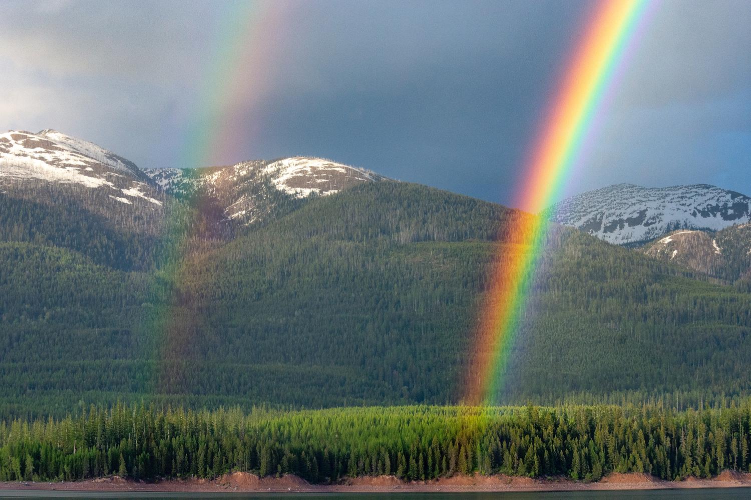 Rainbow over Hungry Horse Reservoir in Montana with snow-capped mountains and green pine forests in the background.